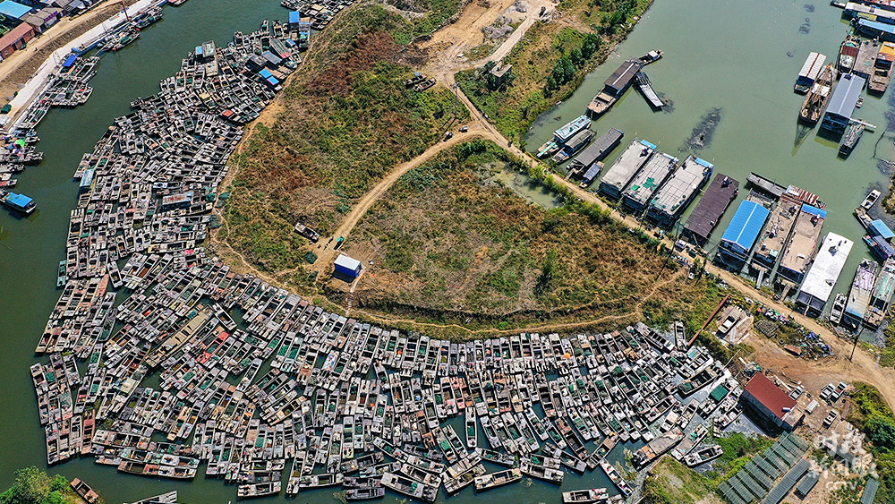 △國家實施長江流域禁捕退捕政策後,江蘇宿遷泗洪縣啟動洪澤湖水域禁捕退捕和住家船整治工作。這是聚集在漁港等待拆解的漁船。
